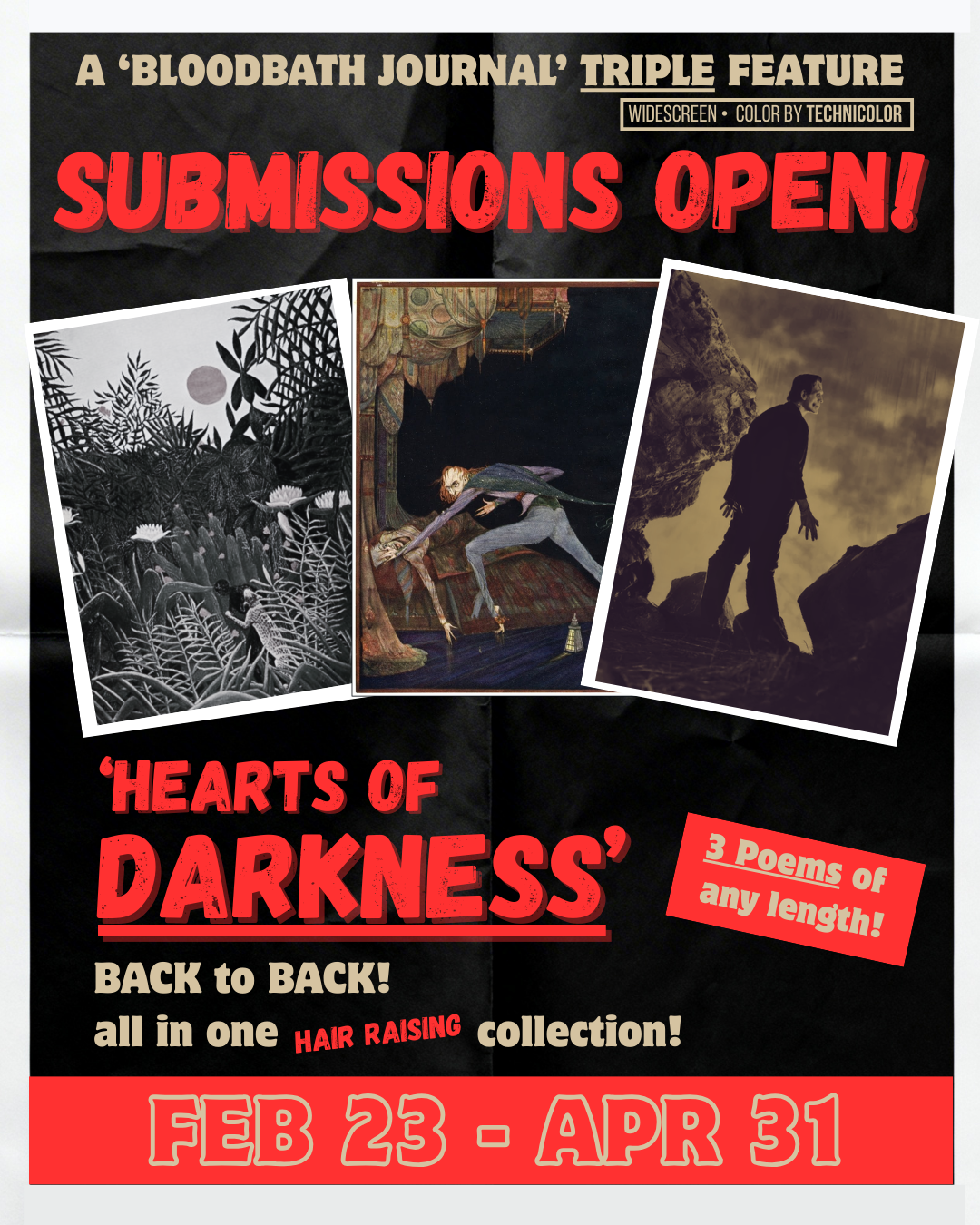 Submit up to three previously unpublished poems of any length to bloodbathjournal@gmail.com.